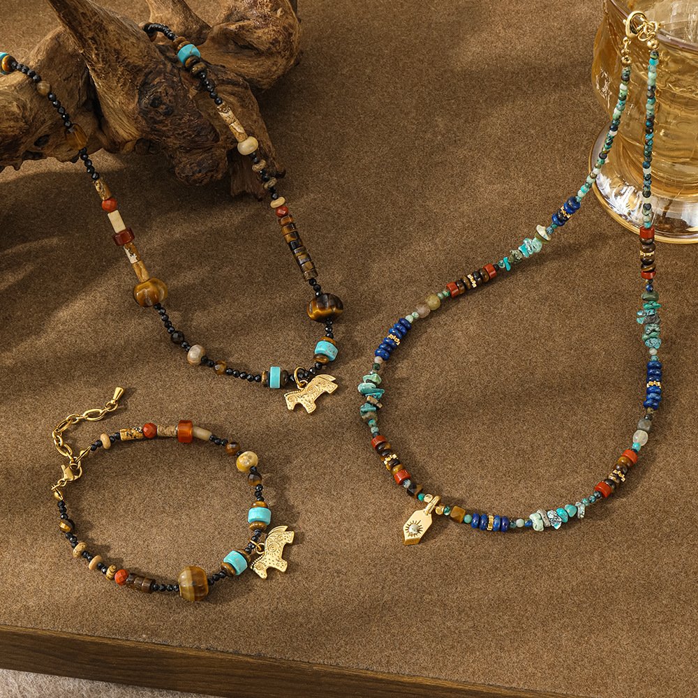 This handcrafted gemstone necklace blends natural elegance with artisanal charm. Featuring a harmonious mix of tiger’s-eye, turquoise, and lapis lazuli, each bead showcases unique colors that create a rich, earthy palette to complement any outfit. The design combines delicate 2mm beads with larger 10.5mm accents for a balanced and eye-catching look. At the center, a gold-plated horse pendant (approx. 10 × 16 mm) adds a symbolic touch of strength and freedom. The necklace measures 45 cm with a 5 cm extender, while the matching bracelet is 17.5 cm with a 5 cm extender, ensuring a comfortable, adjustable fit. Perfect for everyday wear or special occasions, this piece brings effortless bohemian style and makes a meaningful gift or a unique addition to your collection.